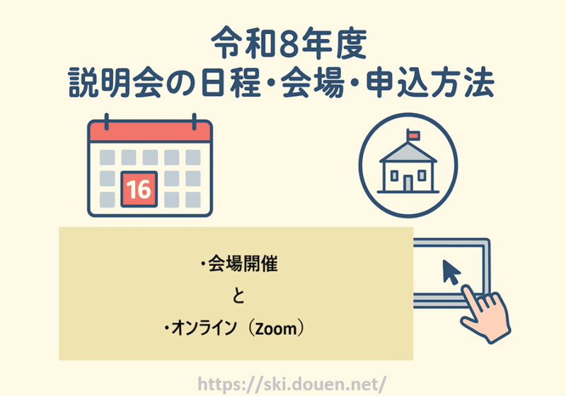 令和8年度(2026年度)向けスキー指導員・準指導員・認定指導員の受検説明会は、会場開催オンライン(Zoom)開催の2方式が設定されています。